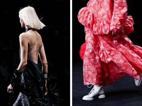 粉色欧根纱花瓣缠绕金属腰链,柔软与锋利形成视觉对冲;暗黑连衣裙的裙摆以不规则花瓣裁片拼接,毛边处理模拟“花瓣绽于刀刃”的冲突感。这一系列以EVVLY独有的浪漫主义,诠释温柔与锋芒的共生。