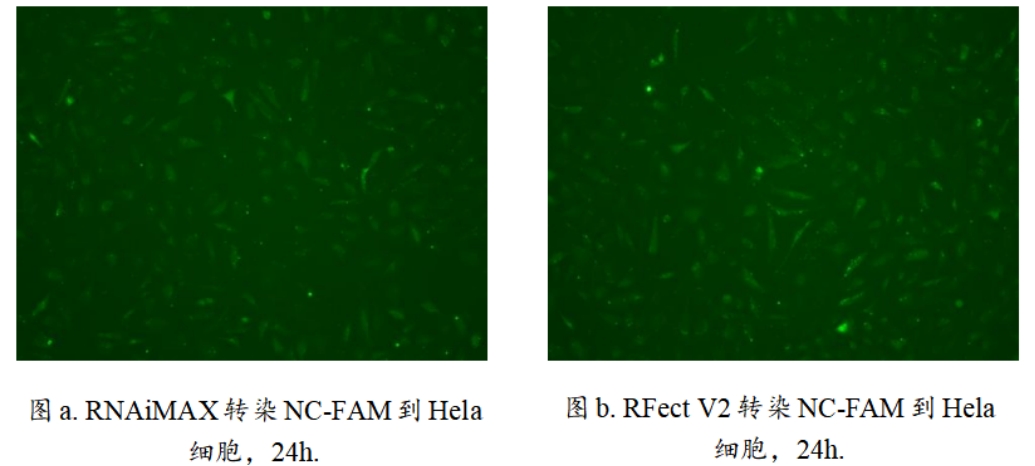 区别于第一代产品,第二代siRNA转染试剂是专门为转染siRNA、miRNA mimics、miRNA inhibitor 等这类小分子核酸研发的,针对性更强的同时,能够使siRNA得到最大程度的转染和胞内释放,以下是RNAiMAX和RFect V2两款siRNA转染试剂转FAM-NC到Hela细胞的荧光图,转染阳性率均可达到90%以上(图a、b)。
