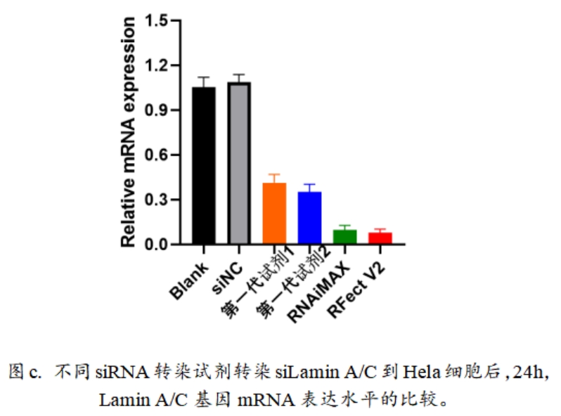 同时,为了进一步对比两代siRNA转染试剂的转染效率,我们将两款一代试剂和RNAiMAX、RFect V2进行了基因沉默效率的比较,在同步转染siLamin A/C到Hela后,24h对不同实验组进行细胞收集,RT-qPCR检测结果显示RNAiMAX、RFect V2两款试剂的敲低效率最高,对Lamin A/C基因敲低效率均在90%以上(图c),可见第二代siRNA转染试剂能够进行高效转染siRNA的同时,也能获得理想的对目的基因的敲降效果。