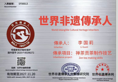 2024年,对李国莉而言,是极具里程碑意义的一年。这一年,经国际非物质文化艺术促进会、中国传统文化发展中心联合评审,认为她全面继承了民族传统文化,精通禅茶贡茶制作非遗技艺,且在非遗传承与传播方面做出了突出贡献,特向她授予“世界非遗传承人”“中国禅茶贡茶非遗传承人”荣誉称号,证书编号20240915001,长期有效。这份殊荣,是对她三十余载坚守与付出的最高肯定,更是对她传承非遗、弘扬中国茶文化使命的激励,让她在非遗传承的道路上,更加坚定了初心,也更加明确了方向。