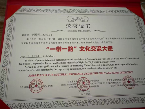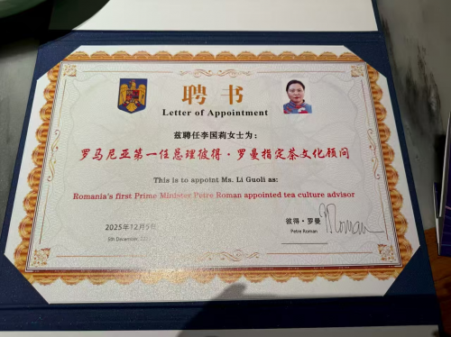 凭借着对茶文化的深厚理解、对非遗技艺的精湛掌握,以及对中外文化交流的赤诚之心,李国莉被授予罗马尼亚第一任总理彼得·罗曼指定茶文化顾问,成为中外茶文化交流的重要纽带。作为指定茶文化顾问,她多次与彼得·罗曼总理交流茶文化,向他介绍中国禅茶贡茶的非遗技艺、历史渊源与茶道精神,带领他感受中国茶文化的独特魅力,推动中罗两国茶文化的交流与合作,增进两国人民的友谊。