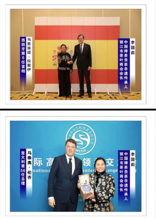 同年9月21-22日,国际领袖欢迎晚宴在北京隆重举行,欢迎访华的意大利前总理马泰奥·伦齐、西班牙前首相拉霍伊及法国前总理德维尔潘等政要。经过层层筛选,李国莉的云南贡茶被选定为赠送给法国前总理德维尔潘的礼物。这款云南贡茶选料于云南省云县百福田村大叶种贰嗄紫树,采用纯手工艺制作,茶形为沱形,上面还印有李国莉亲手书写的“福”字。