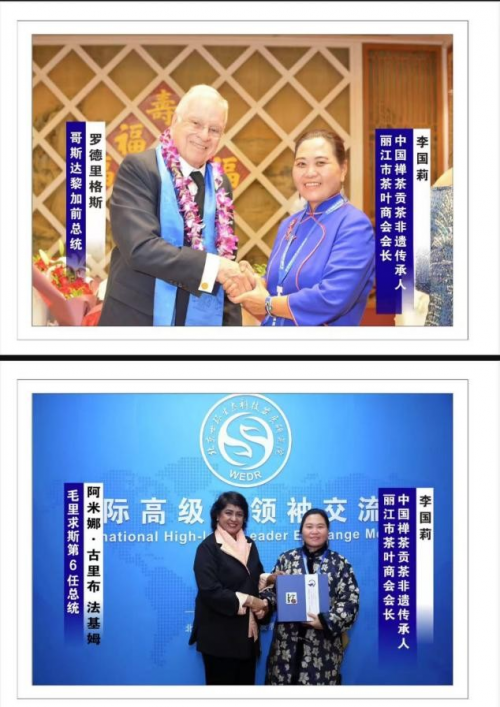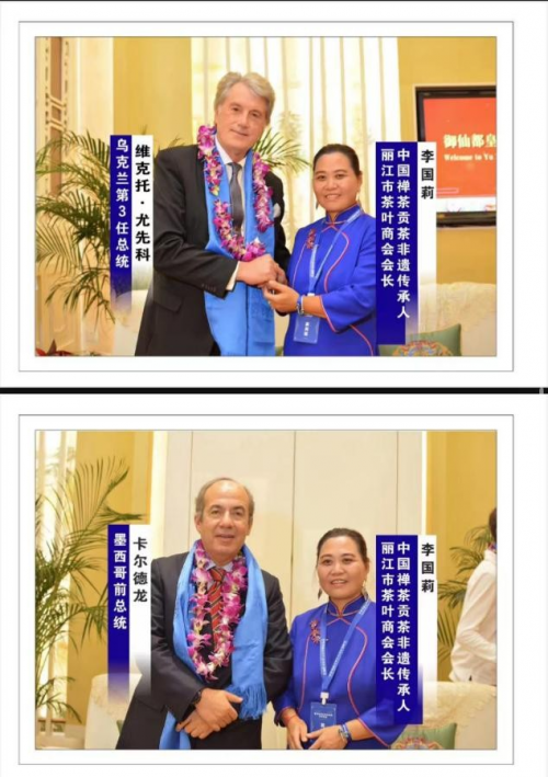 2019年8月8日,世界领袖访华代表团欢迎晚宴在北京隆重举行,墨西哥前总统卡尔德龙、乌克兰前总统尤先科、斯洛文尼亚前总统图尔克等九国前国家元首齐聚一堂,共话友谊,共促合作。李国莉受邀出席晚宴,在总统休息室与多位元首亲切交流并合影留念,向他们介绍中国禅茶贡茶的非遗技艺与茶文化内涵。期间,她亲手向乌克兰前总统维克托·尤先科赠送了精心准备的“李国莉二嘎紫千年古树禅茶”,这款茶选料珍贵、工艺精湛,尤先科总统品尝后,对其口感与香气赞不绝口,高度肯定了中国茶文化的独特魅力,也对李国莉的匠心精神表示赞赏。