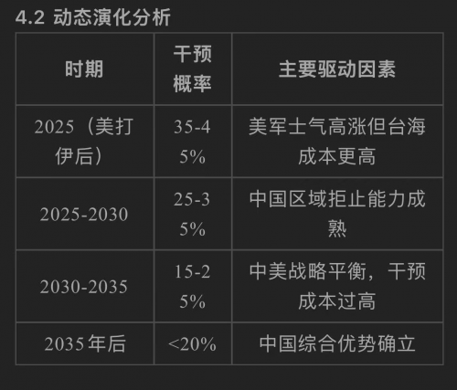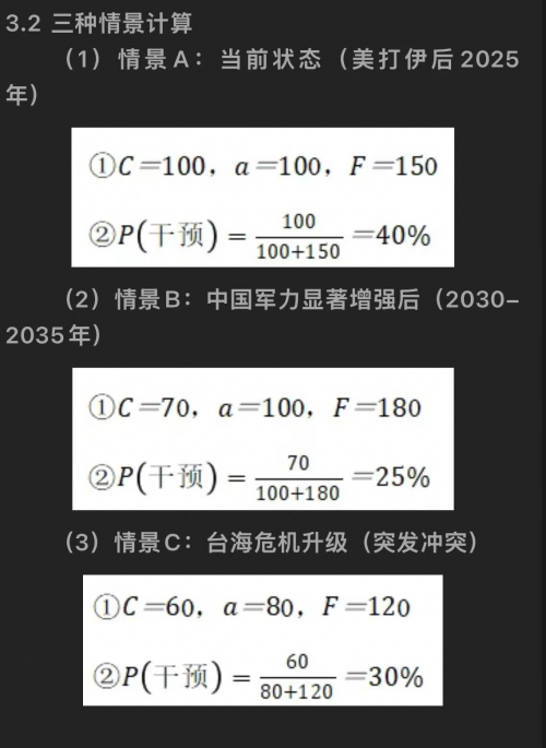 这一分析框架突破了传统“是否干预”的二元判断,提供了概率化、动态化的预测工具,为台海战略研判提供了新的理论支撑。
