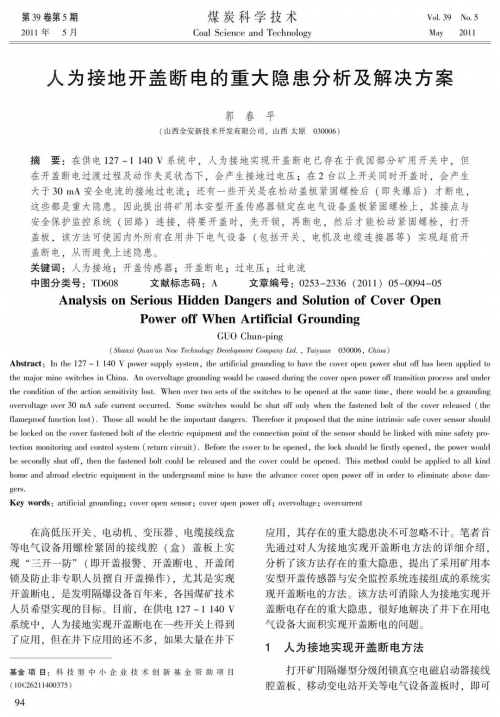 2011年5月,著名刊物《煤炭科学技术》第39卷第5期刊登了国务院特贴煤矿电气专家郭春平的优秀论文——《人为接地开盖断电的重大隐患分析及解决方案》,该论文一经发表便引发业内广泛关注。