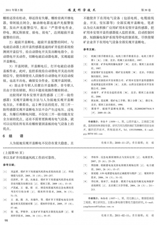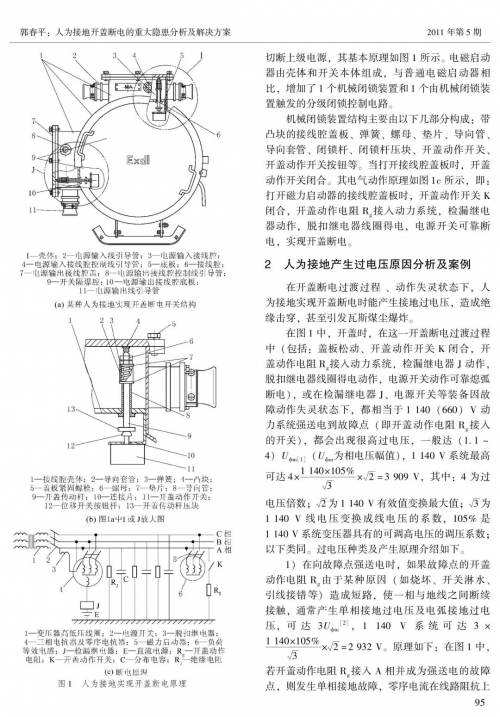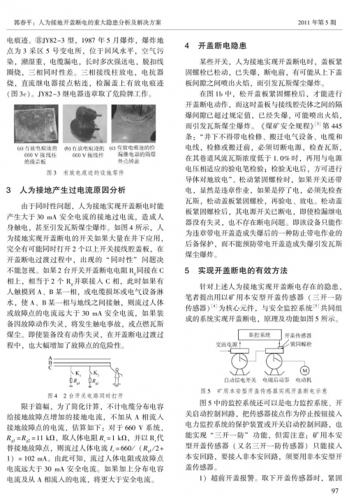 论文指出,在供电127—1140V系统中,人为接地实现开盖断电的方法在开盖断电过渡过程及动作失灵状态下会产生接地过电压,在2台以上开关同时开盖时会产生大于30mA安全电流的接地过电流,还有一些开关是在松动盖板紧固螺栓失爆后才断电,这些都是重大隐患。针对这一问题,郭春平提出将矿用本安型开盖传感器锁定在电气设备盖板紧固螺栓上,实现“先开锁、再断电、后开盖”的超前开盖断电方案,可使国内外所有在用井下电气设备消除上述隐患。
